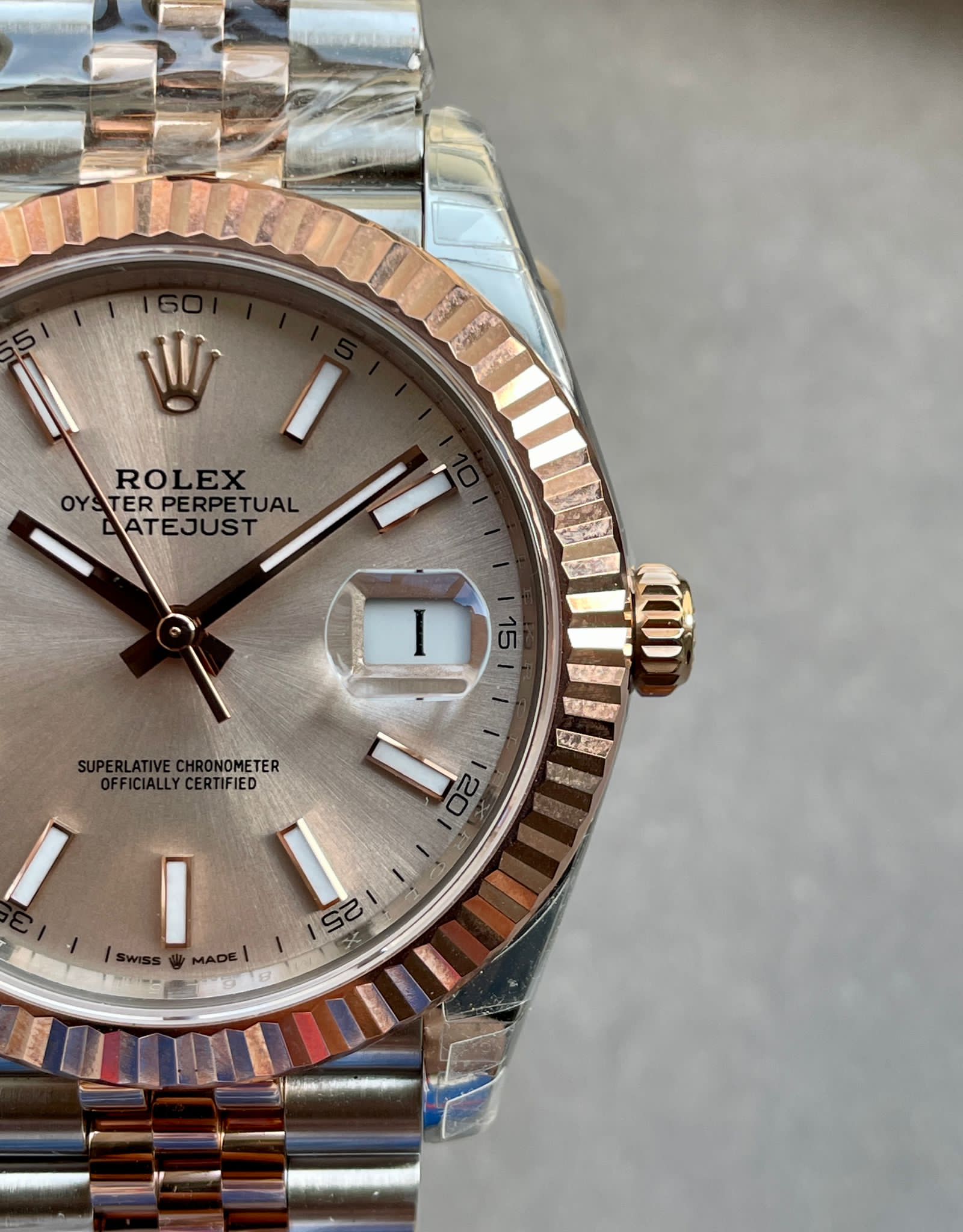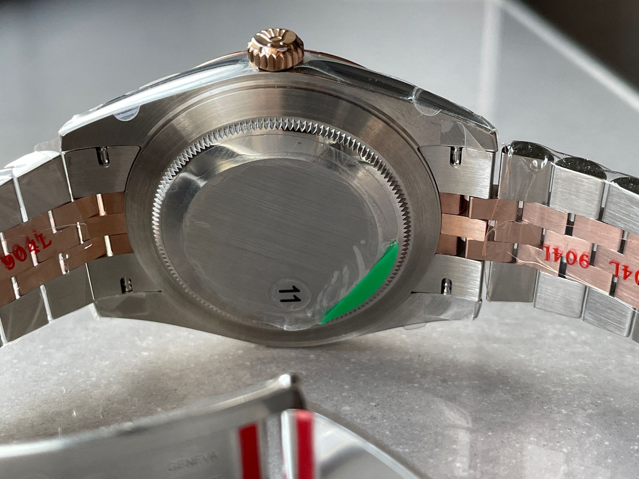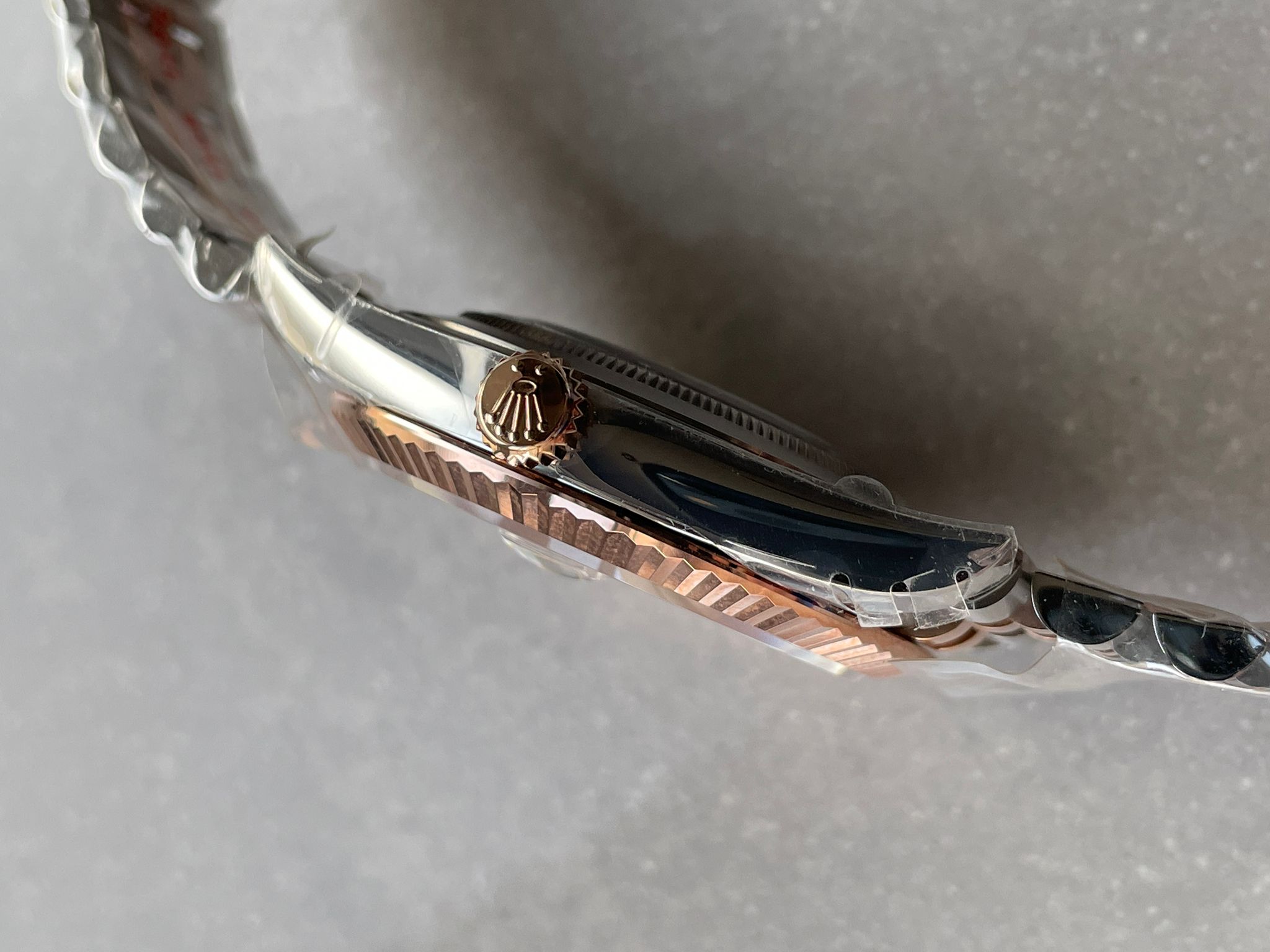 | bezel | 18K rose gold plated solid fluted stainless steel bezel, same shape as genuine |