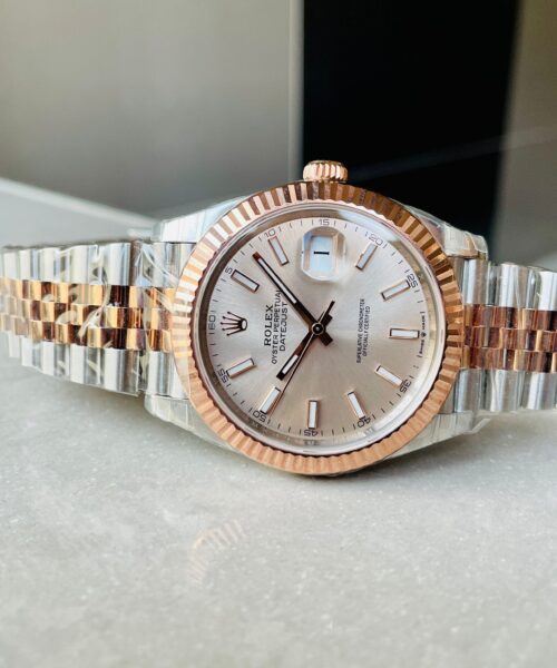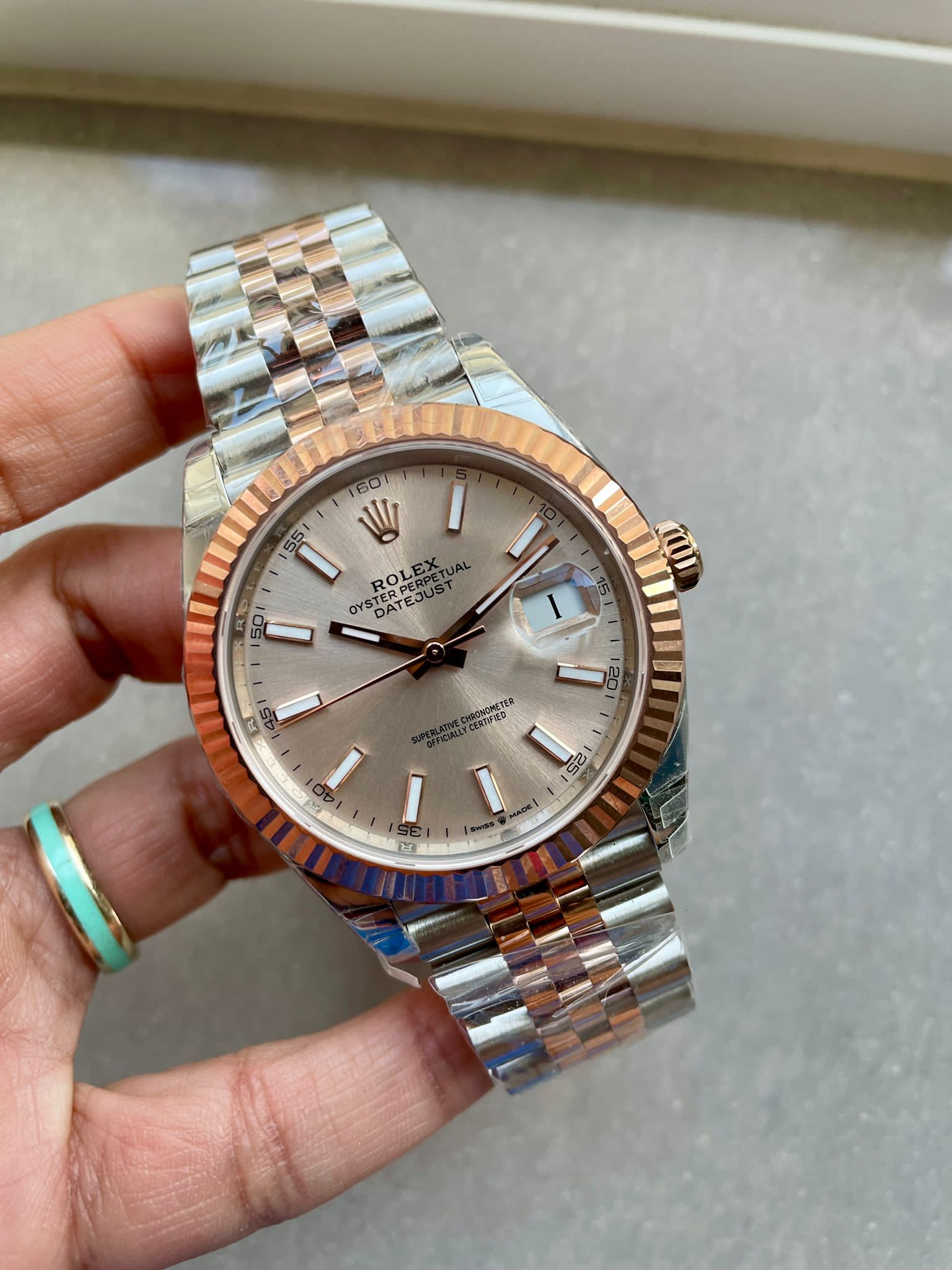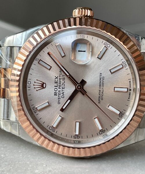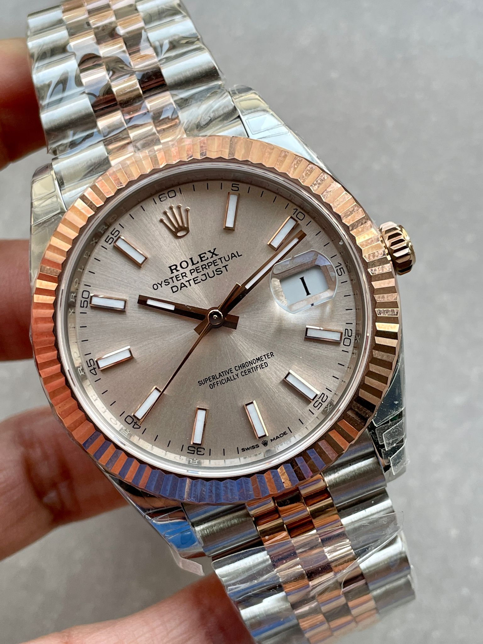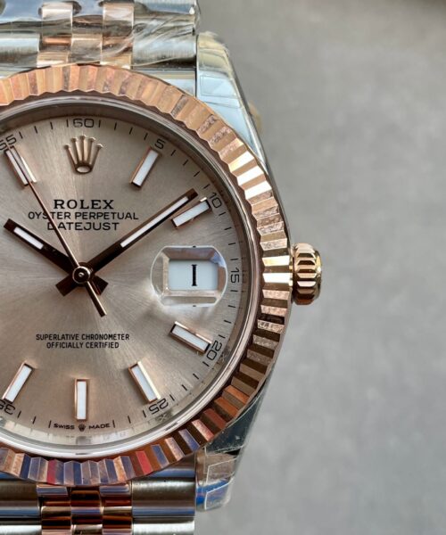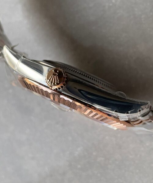 | bezel | 18K rose gold plated solid fluted stainless steel bezel, same shape as genuine |