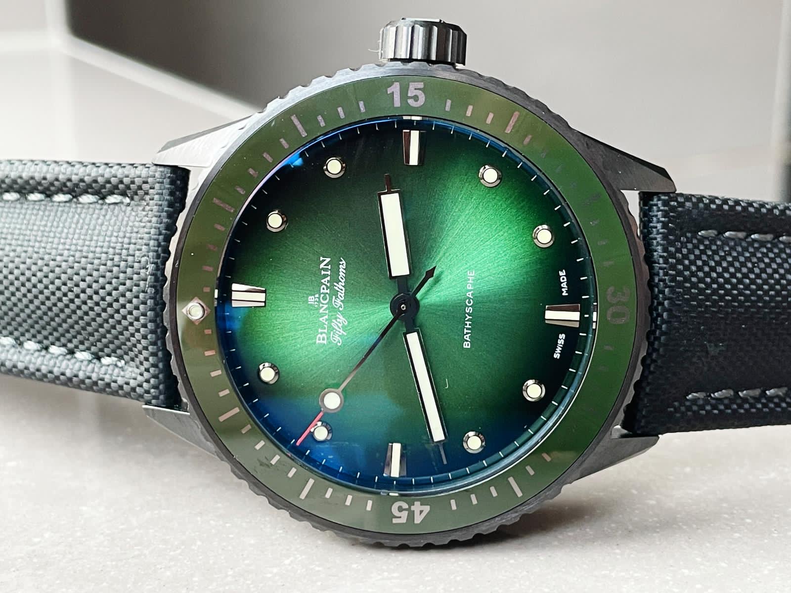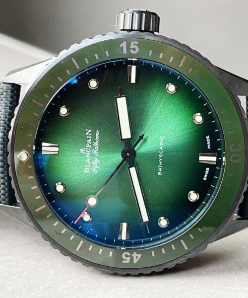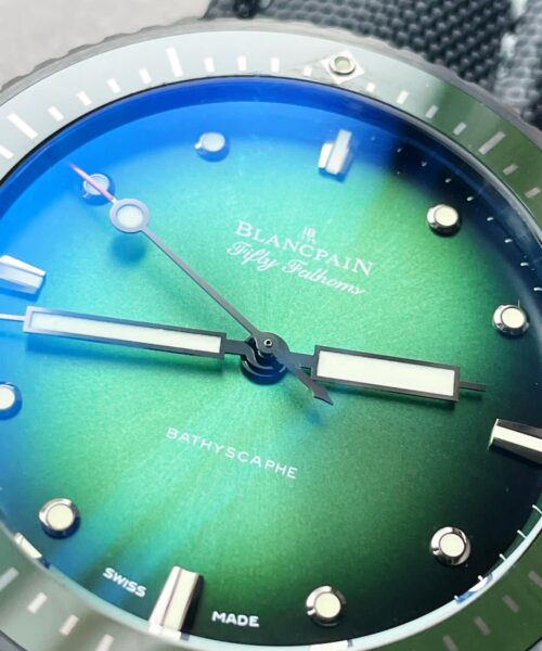 | Bezel | Unidirectional satin-brushed grey ceramic bezel with green ceramic insert and Liquidmetal hour markers |