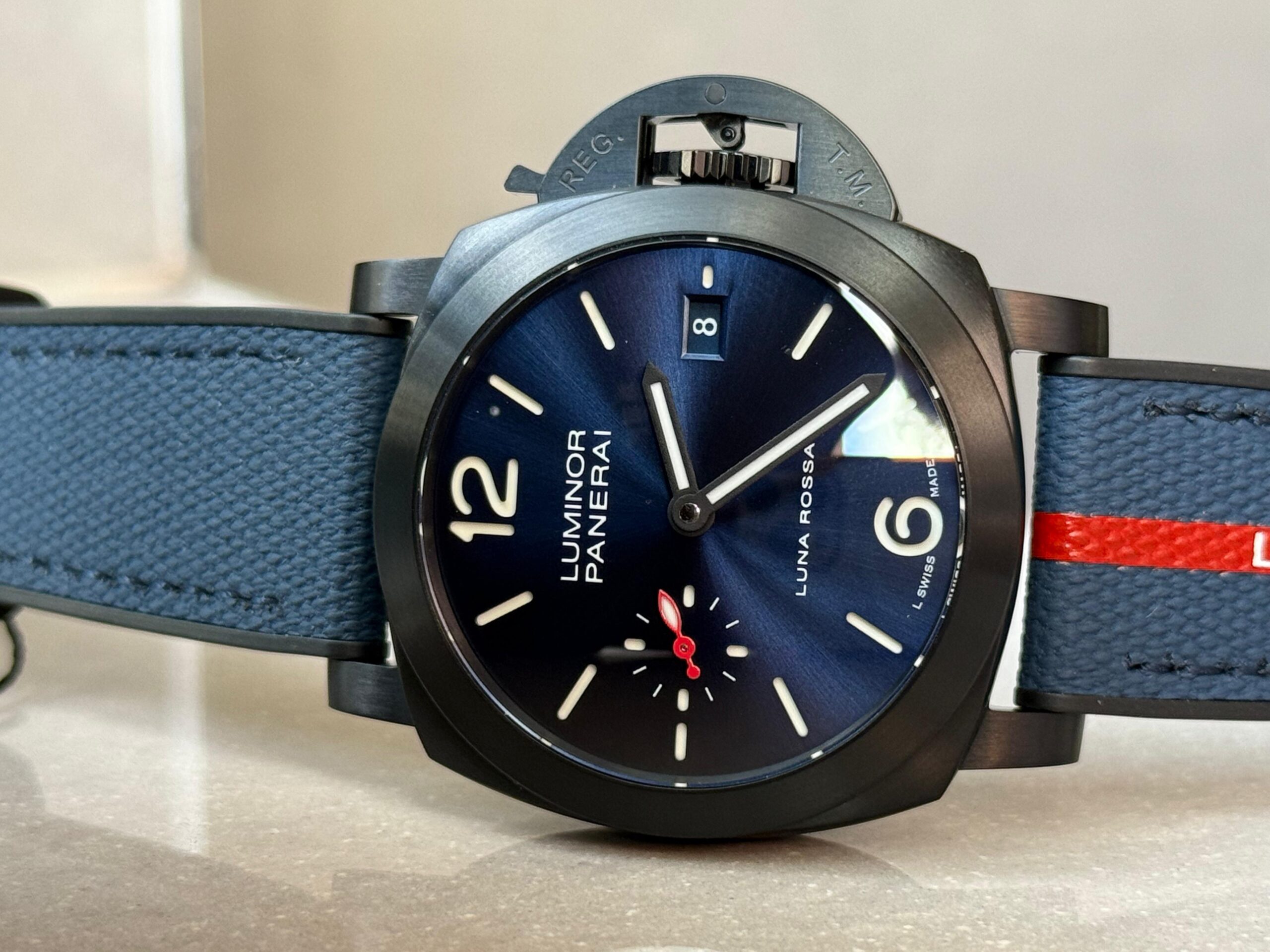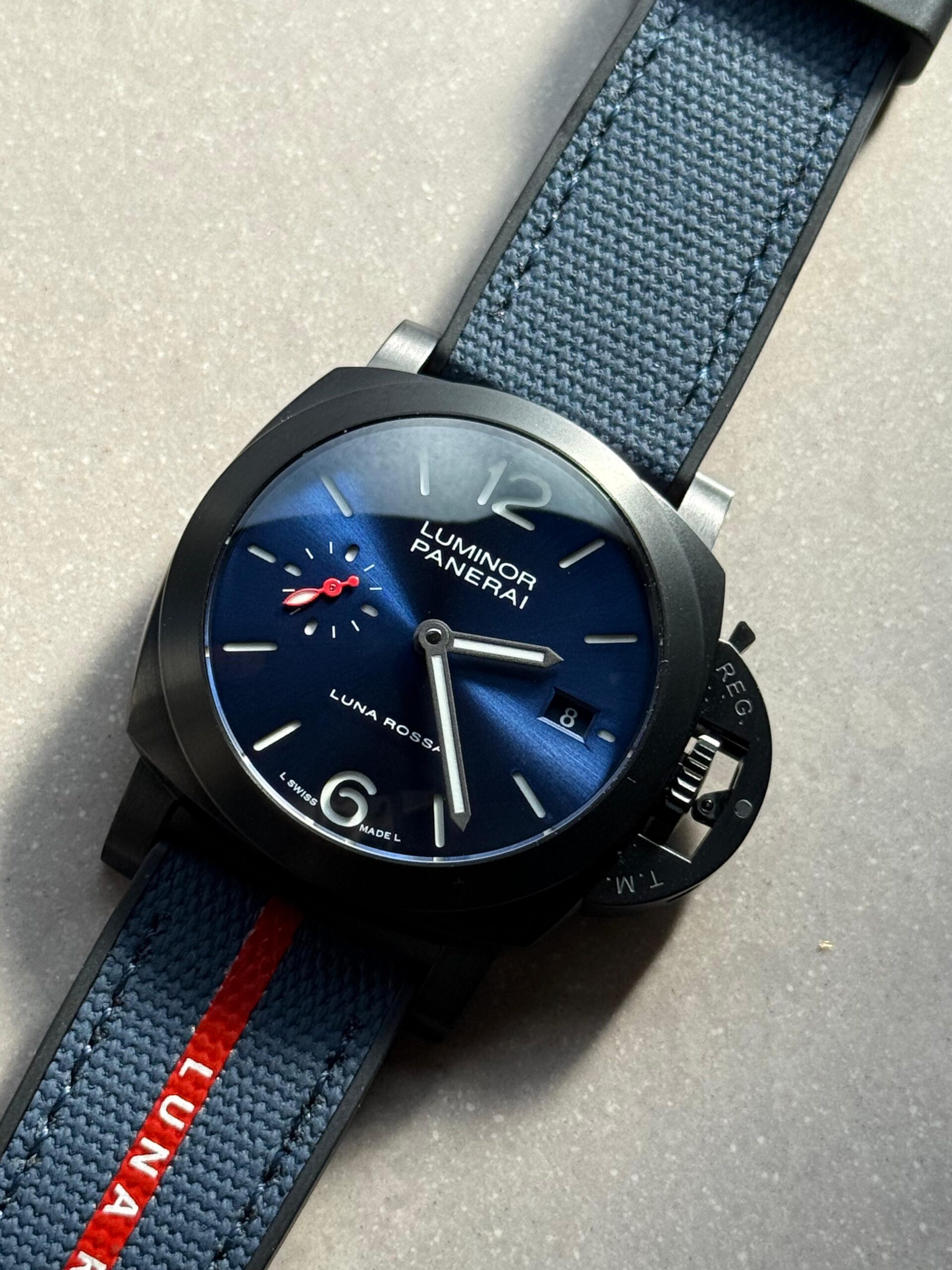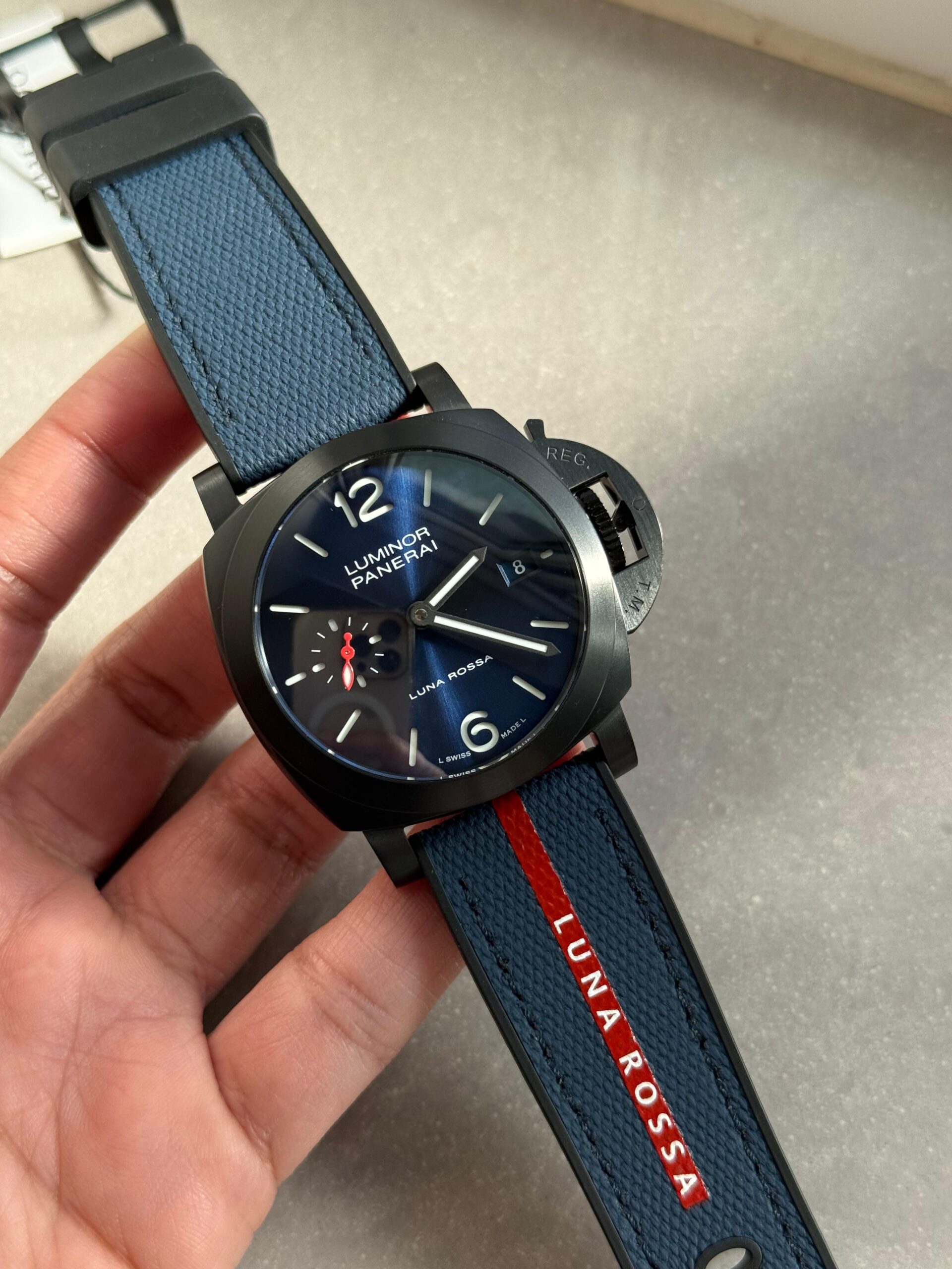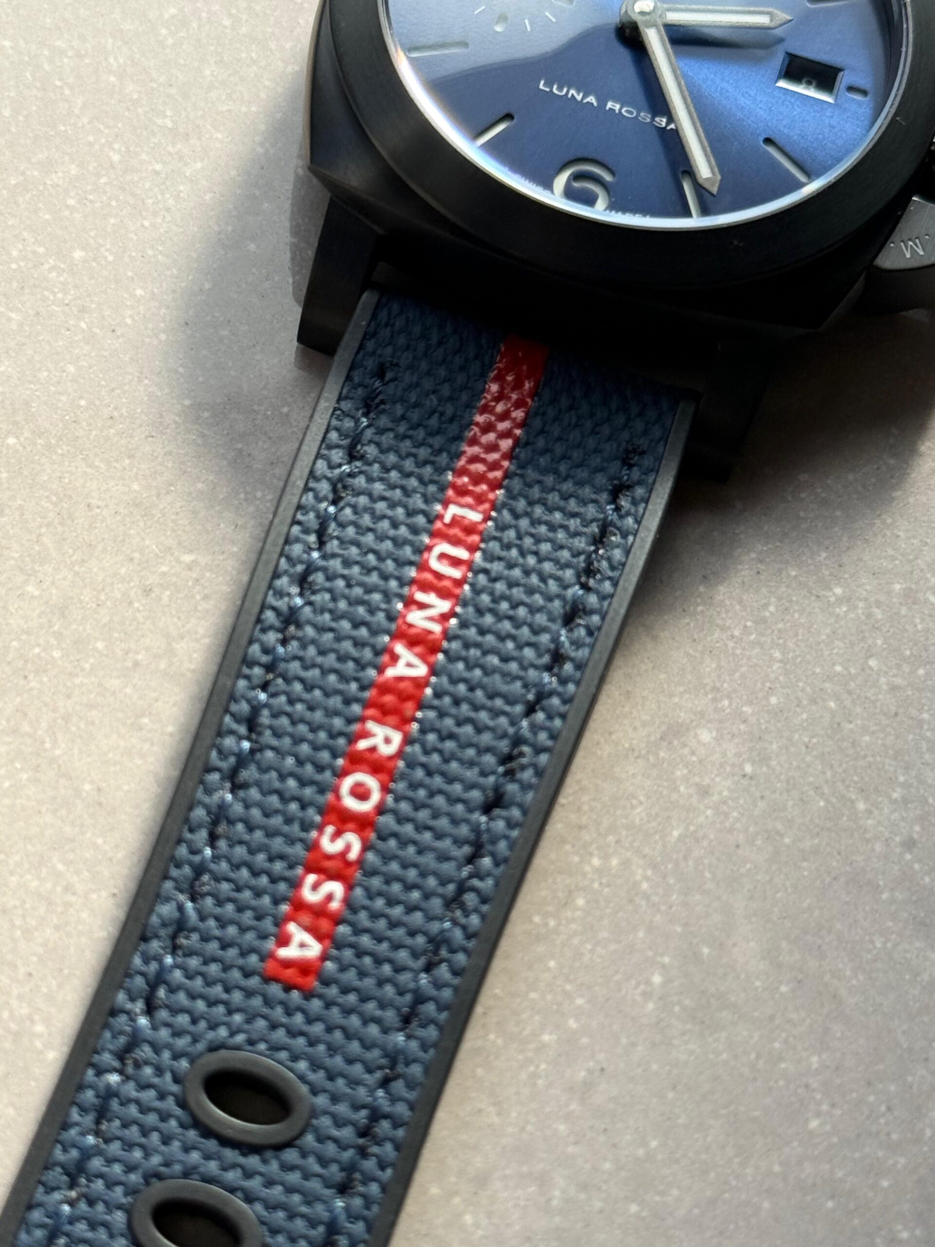 | Strap | Bi-material rubber/textile Luna Rossa dark blue Strap with Tang buckle |