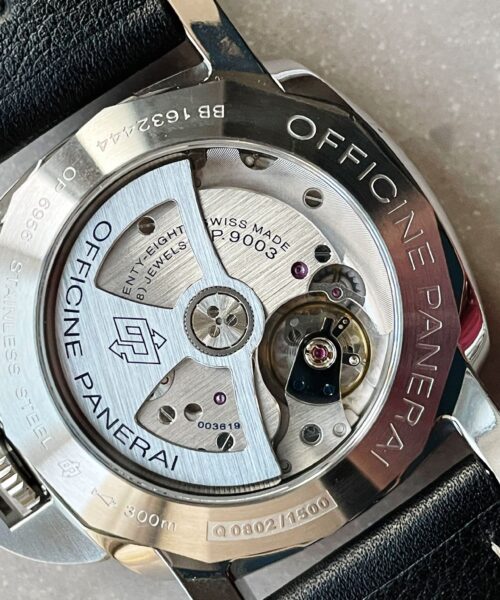 | Movement : | SPECIAL MADE LOOKS LIKE PANERAI IN-HOUSE P.9003 MOVEMENT. BASED ON UPDATED CUSTOM DESIGNED ASIAN AUTOMATIC. 28.800 VPH.SAME BALANCE WHEEL POSITION AS GEN. P.9003 MOVEMENT |