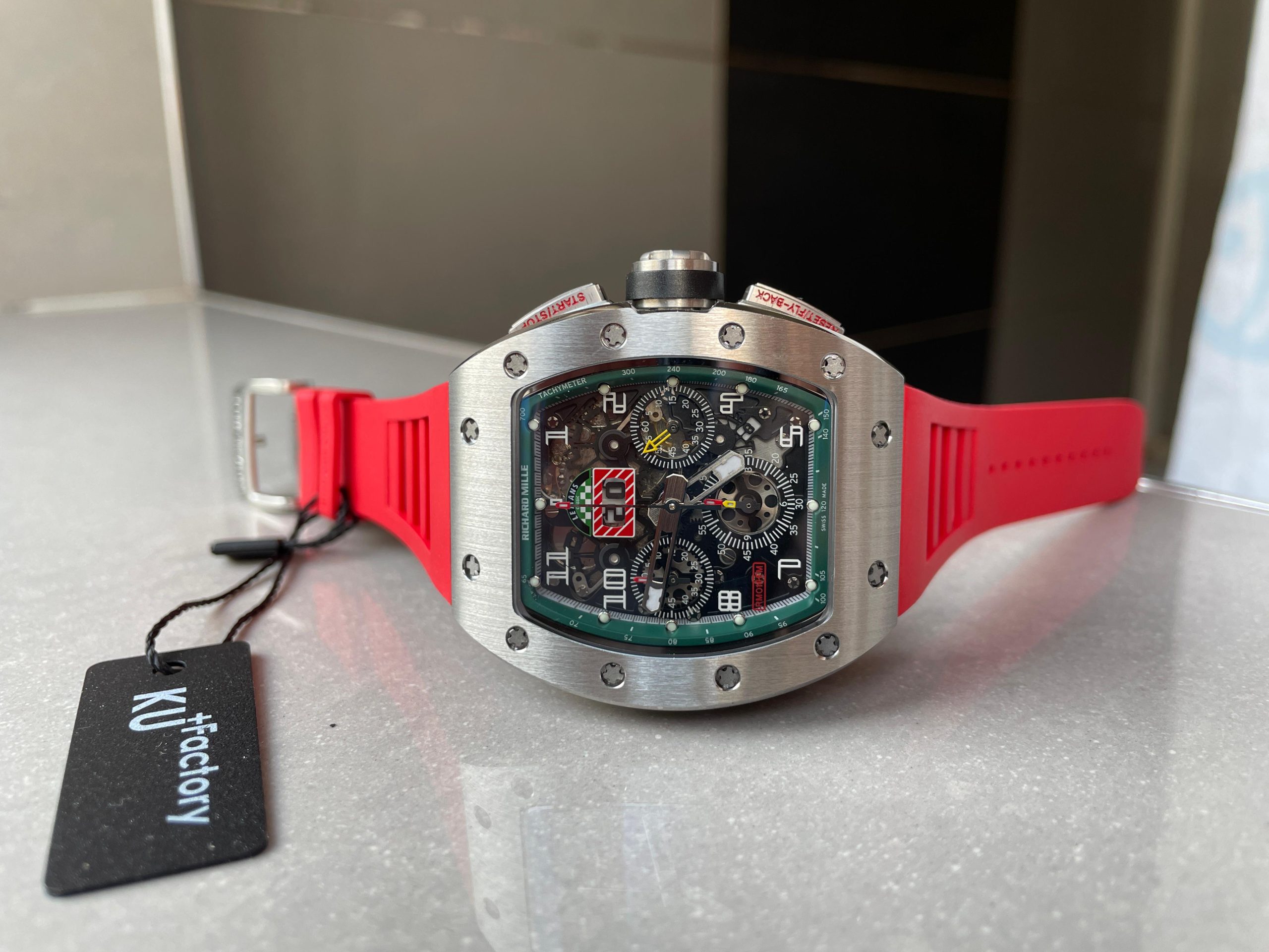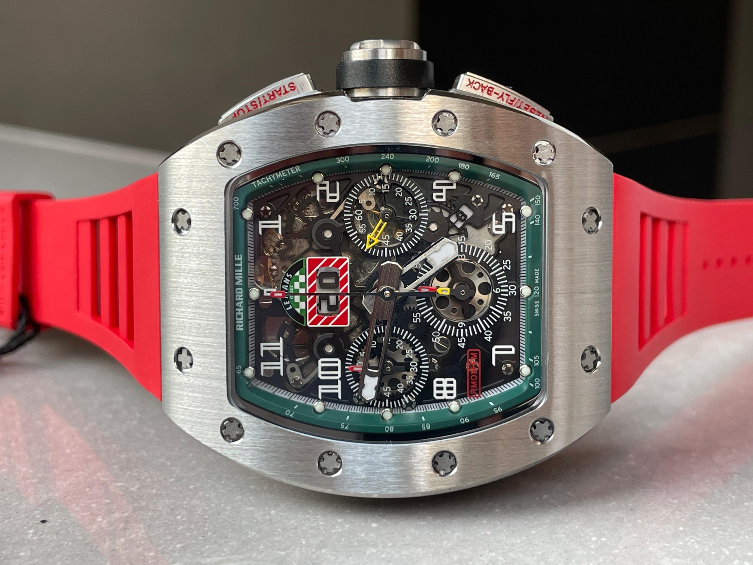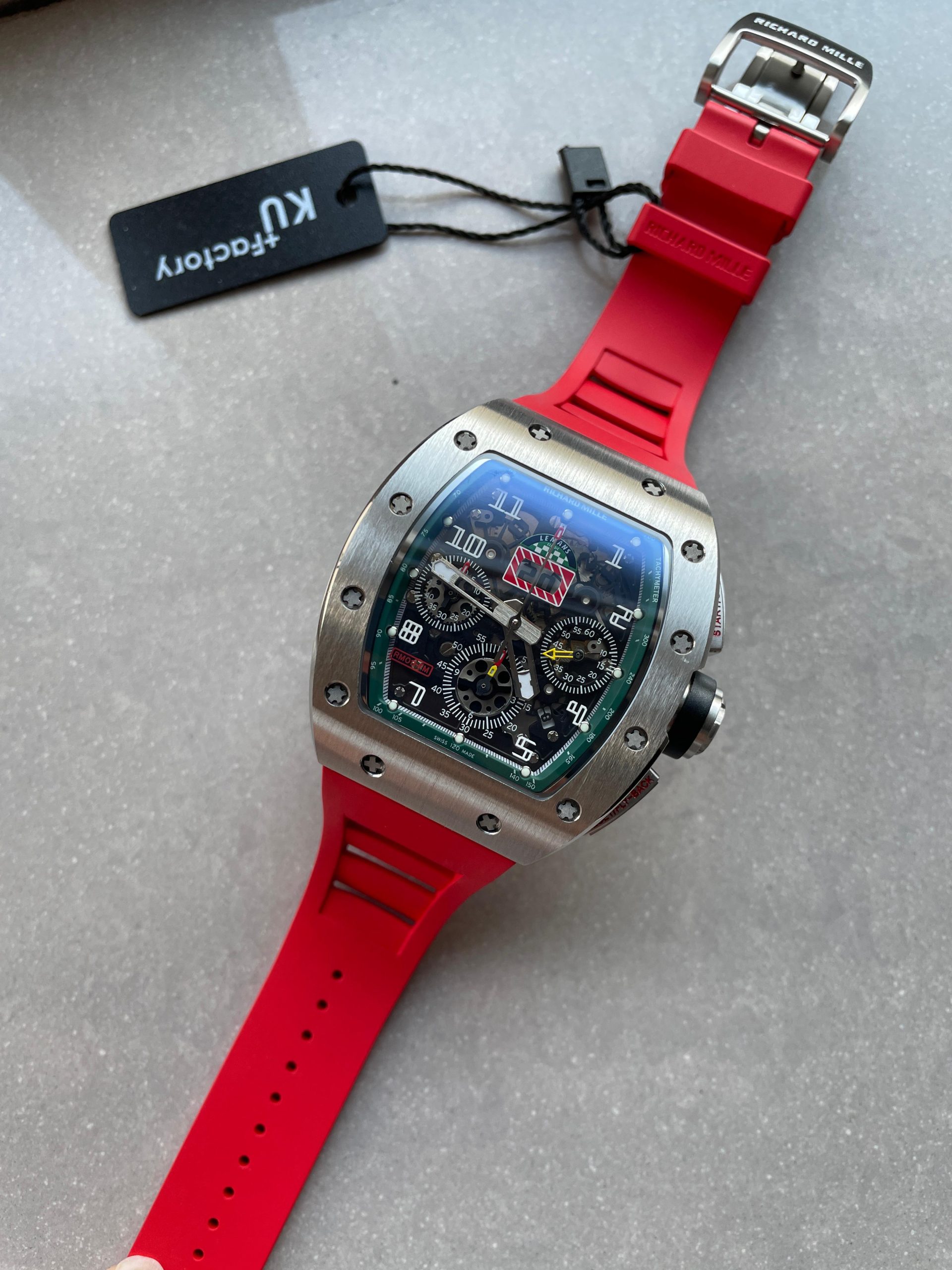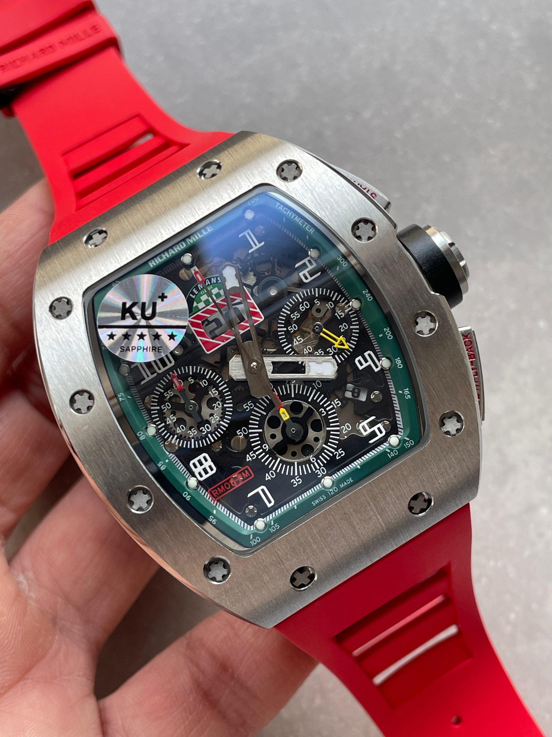 | movement | Asian 7750 automatic chronograph movement with big date display decorated to RM movement; t 28,800 VPH |